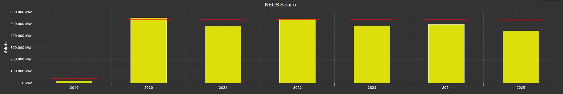 Das Projekt „NEOS Solar 5“ mit flacher Nord-Ost und Süd-West-Ausrichtung wurde inBannewitz Ortsteil Possendorf auf dem leichten Schrägdach der ReitanlagePossendorf errichtet. Die Photovoltaikanlage mit monokristallinen Green Wing Modulen mit Linear Performance Garantie ist im August 2019 in Betrieb gegangen.Die Sonneneinstrahlung am Standort lässt sich gut einschätzen, da auf die historischen Daten des Solarstrahlungsatlases und die vorhandenen Erzeugungsdaten zurückgegriffen werden kann. Zwei unabhängige Berechnungen und die bisherigen Abrechnungen aus dem ersten Betriebsjahr lassen nach konservativer Rechnung einen Ertrag von durchschnittlich 538.276 kWh im Jahr erwarten. Mit dieser Anlage kann der jährliche Bedarf von 225 Haushalten im Umkreis bilanziell durch sauberen Strom vom Dach gedeckt werden und ca. 255.000 Kilogramm klimaschädliches Kohlendioxid vermieden werden. Die DETOplus GmbH überwacht und wartet die Anlage. Sie ermöglicht eine effektive Fernüberwachung des Systems. Zudem wird damit das gesetzlich vorgeschriebene fernsteuerbare Einspeisemanagement mit Blindleistungsregelung des Netzbetreibers DREWAG umgesetzt. Der Wechselrichter stammt vom chinesischen High-Tech – Hersteller Huawei. Durch eine Konvektionskühlung ohne Lüfter, einen integrierten Überspannungsableiter (Typ II,AC/DC) und der Abdichtung nach IP65 ist er besonders langlebig und hat einen hohen Wirkungsgrad von 98,6 Prozent. Projektierer des gesamten Projektes ist die BETA PV4 UG & Co. KG aus Stuttgart. Ausführender Installateur war die Hanssolar GmbH aus Dresden.